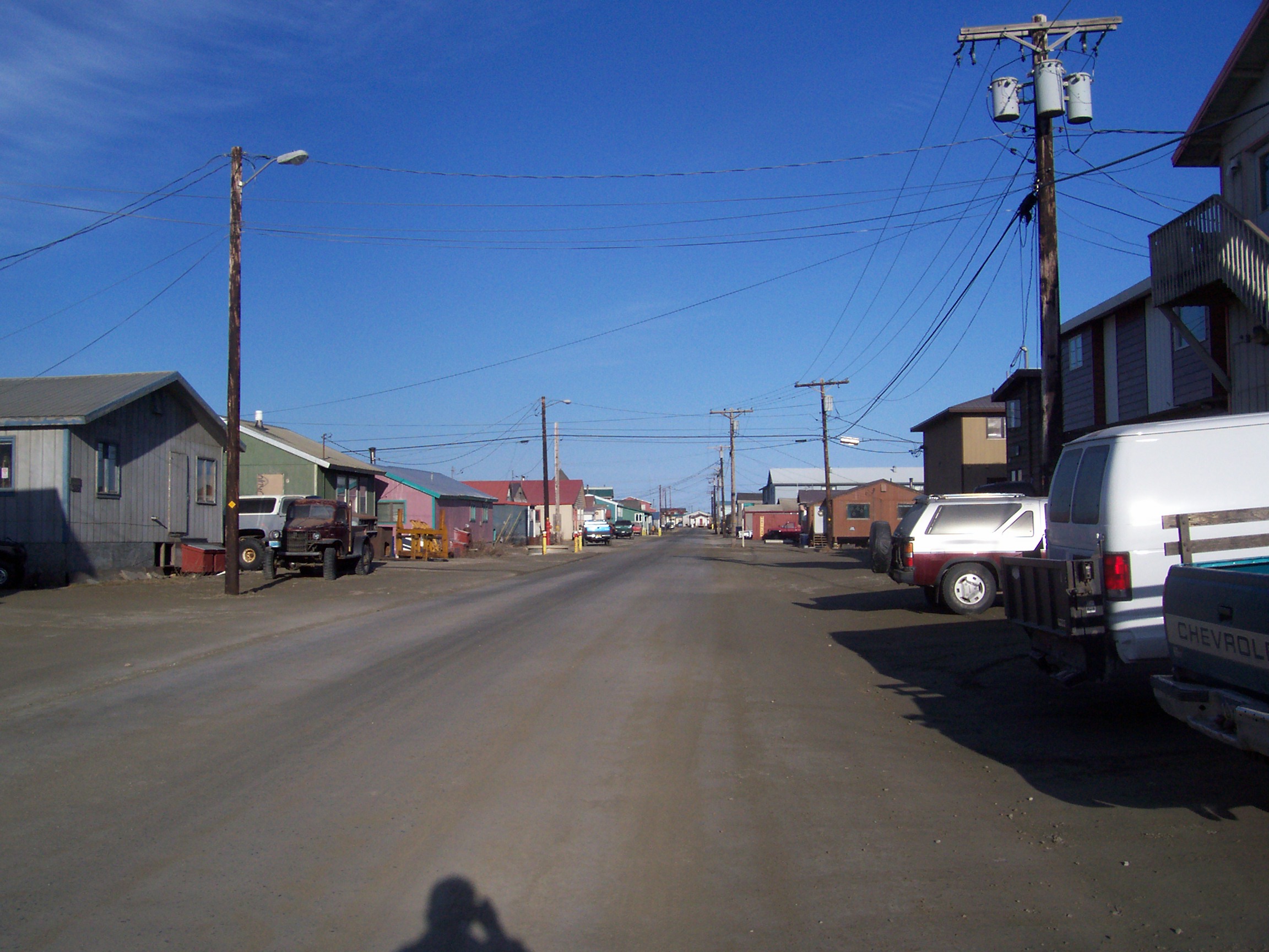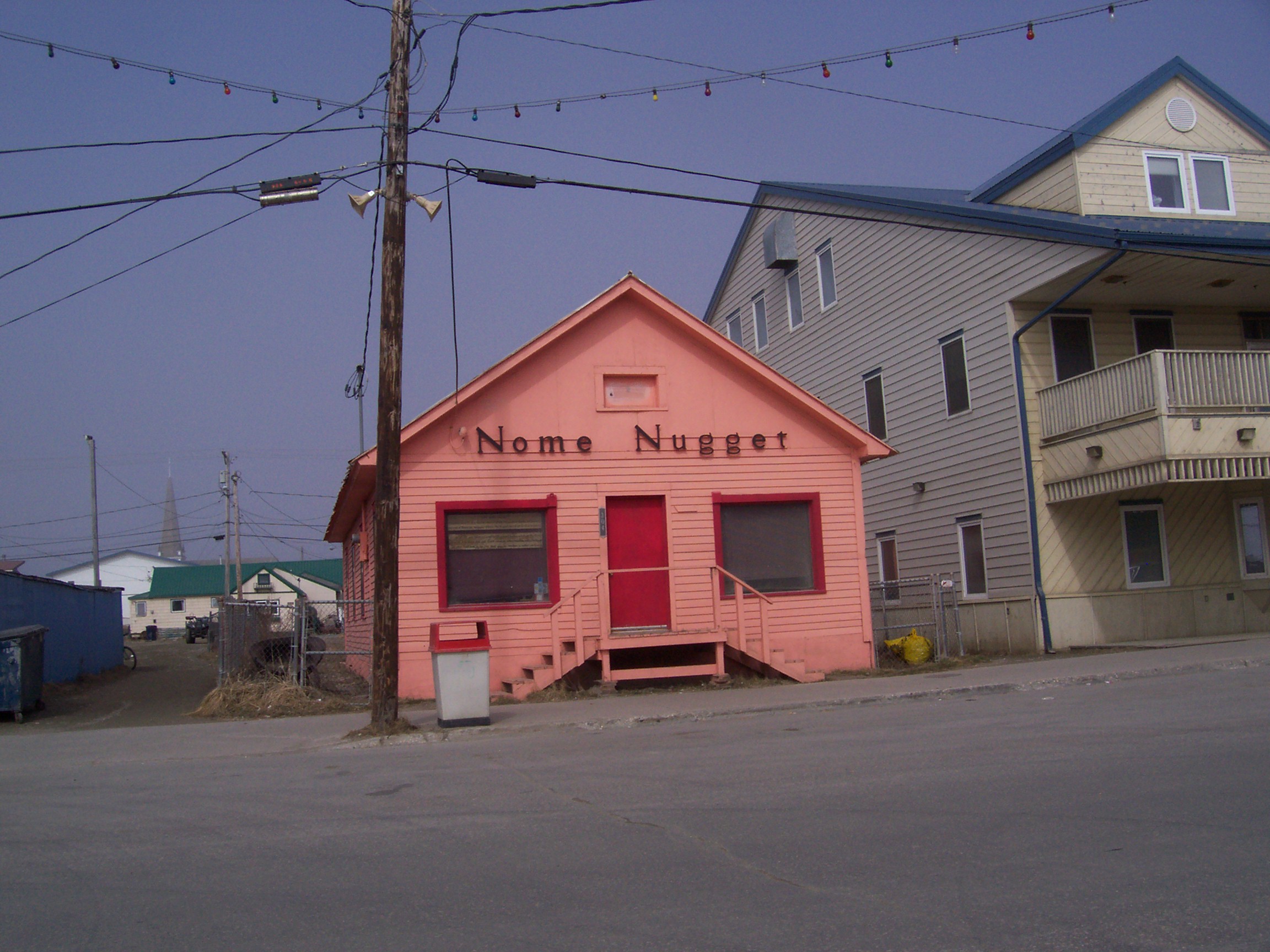 Mellanlandning på Kotzebue precis norr om polcirkeln. Efter ett kort stopp där fortsätter vi söderut mot Nome, över snöklädda berg och många vattendrag. Jag fotograferar områden där Aksel och hans kompanjon George Anker idkade trapper- och guldgrävarliv. Här var Aksel nära att omkomma i en snöstorm, men räddades i sista stund av George och hundspannet. Vi kom till hotellet i Nome sent på kvällen. Aurora Inn är ett nybyggt och propert hotell som ligger mittemot den gamla hamnen, dit Aksel kom för 77 år sedan i en liten landstigningsbåt från ångfartyget Viktoria, som ankrade en bra bit ut från land.