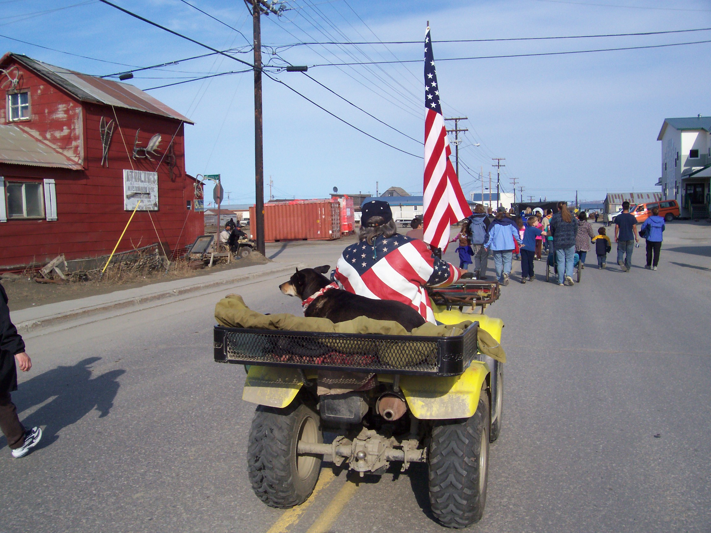 På hemväg åkte vi förbi Osborne Creek, där Aksel jobbade första sommaren och en del av hans andra sommar i Nome. Memorial Day firas över hela USA och jag följde med paraden som gick fram på västra delen av Font Street – Nomes strandväg – till kyrkogården. Där hölls flera tal, bland annat av borgmästaren, officerer från militären och eskimåernas ålderman. Man ärade speciellt alla som har dödats under krig.